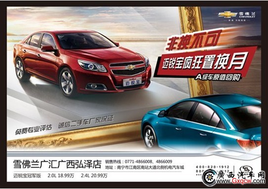 弘澤雪佛蘭本周末(9月15、16日)開(kāi)展邁銳寶瘋狂置換活動(dòng)。只要您的車車況良好,且三年無(wú)事故,不限品牌,均有機(jī)會(huì)享受最高原價(jià)回購(gòu),相當(dāng)于免費(fèi)開(kāi)了三年車,老車立即升級(jí)為時(shí)下熱賣的美系B級(jí)車——“雪佛蘭全球中高級(jí)旗艦車型”邁銳寶,再享最高3萬(wàn)元鉅惠。(廣西弘澤雪佛蘭擁有活動(dòng)解釋權(quán)。)