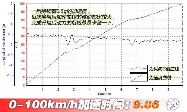 加速測試中起步至關(guān)重要,為了不讓車輪嚴(yán)重打滑,我們將起步轉(zhuǎn)速控制在2000rpm左右,一擋的勢頭比較迅猛,加速度持續(xù)保持在0.5g左右,但是升擋后動力總會有一個間歇,銜接會出現(xiàn)卡頓,這種現(xiàn)象日常駕駛中是沒有的。
