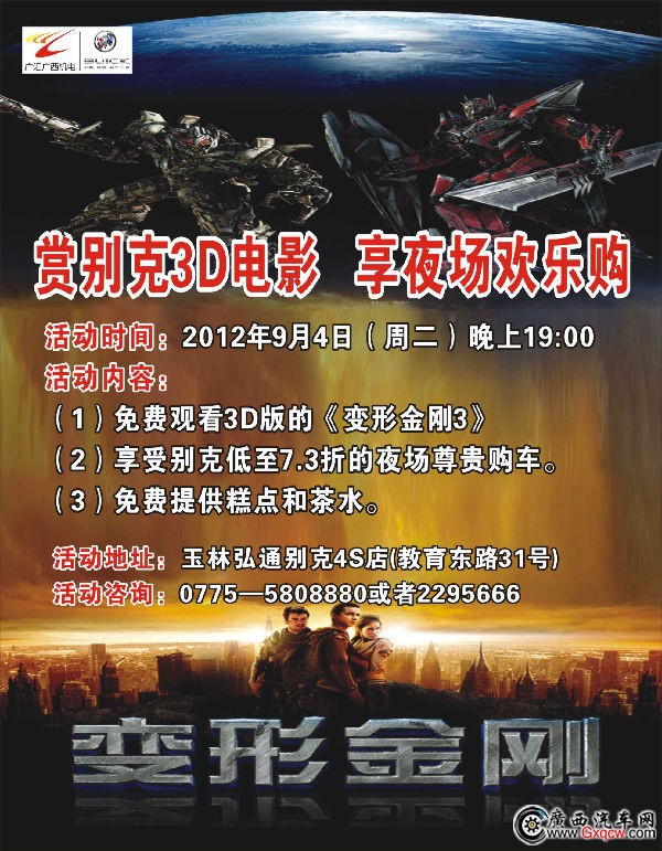 一場真實(shí)映入眼簾的擎天柱率領(lǐng)“汽車人”與霸天虎激烈作戰(zhàn)即將于9月4日晚在玉林震撼上演,上海通用別克攜手玉林弘通別克4S店將于9月4日晚上19:00 -21:30在玉林弘通別克4S店的展廳放映3D版的《變形金剛3》,屆時你將如同身臨其境,體驗(yàn)作戰(zhàn)的激情,讓你埋藏已久的正義沖動得以發(fā)泄。