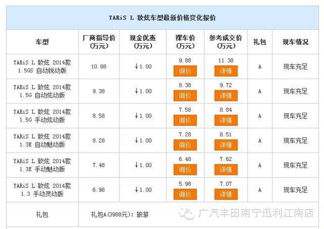 近日,廣汽豐田迅利店內(nèi)YARiS L 致炫現(xiàn)車銷售,顏色可選,目前購車部分車型可優(yōu)惠1萬元,感興趣的朋友可以到店咨詢購買,詳情見下表: